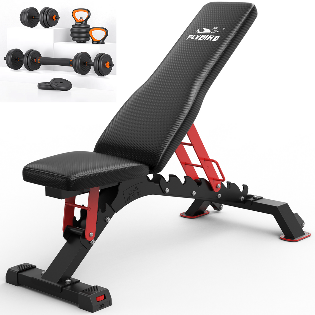 Sparkle into 2024! Use code NY35 at checkout to get 35% off! Orders Ship in 24hrs.The Flybird Pro Weight Bench has been updated with wheels. Now you can move this beast of a bench around with little to no effort!Be the athlete you always imagined. We believe that there's always room for improvement, so we designed the Flybird Weightbench to enable you to achieve your personal best. This bench has 7 backrest positions and 3 seat positions so you can do all kinds of different exercises. Add more value to your training by laying back while doing crunches or obliques. The bench's durable, high-density foam padding provides comfort and support while exercising. The bench can be positioned at 90 degrees for seated press, bent over rows, inclines, and decline exercises.Pro Weight Bench SpecificationsLength: 48'' (122 cm)Width: 13'' (33 cm)Height: 17.7'' (45 cm)Backrest Length: 34'' (87cm)3 Seat Options: flat, 13Adeg, 25Adeg7 Back Options: 24Adeg, 40Adeg, 50Adeg, 69Adeg, 90Adeg, flat, and -11AdegWeight Capacity: 1200lbsItem Weight: 48.5LBFurthermore, we provide you with this one-stop solution:Pro Weight Bench+ Eco-Friendly Multi-Functional Weight Set.Still got the headache that all your essential equipment takes up way too much space? Here's the answer! Get dumbbells, kettlebells, barbells, and push-up stands in just one weight set!You can do so many exercises with the set, and the best part is, it can be stowed conveniently in a cupboard, under your bed, or wherever you want, really.Now, here's the catch. We coat the gripping bars with ABS (Acrylonitrile Butadiene Styrene).Characteristics of ABS:DurableStructurally stableResistant to corrosion, impact, chemicals, and wearNon-toxic and safe to useFully recyclableSo get this odor-free weight set with our Pro Weight Bench, and start your fitness journey in the comfort of your living room!Weight Options: 50lb/70lb/90lbProduct details: Multi-Functional Weight SetMulti-Functional Dumbbells Specifications:Weights Options: 50lbs/70lb/90lbProduct Dimensions: 22.8"L x 12"W(50lb); 24"L x 12.2"W(70lb); 22.45"L x 12.6"W(90lb)Handle Diameter: 1"Barbell Length: 22.7"Handle Material: Alloy SteelPackage Dimension: 23.2"(L) x 12.3"(W) x 8"(H)