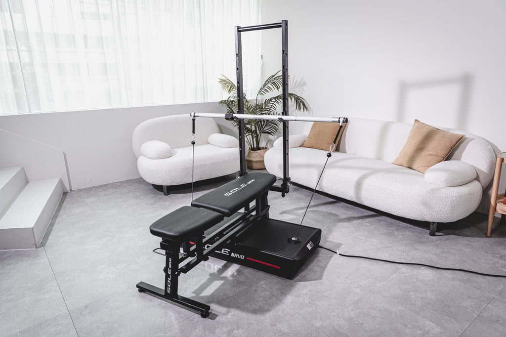 SRVO Complete – Unleash Your Home Gym PowerIntroducing the game-changing SOLE SRVO Complete – Your Ultimate Home Workout Solution!Transform your fitness routine with the groundbreaking SOLE SRVO Complete, the ultimate strength training equipment designed for daily weightlifting sessions in the comfort of your home. The package includes a SRVO Folding bench, Triceps rope, Short bar, and extension safety cables, ensuring a complete and versatile workout experience.Boasting a sleek design and compact size, the SRVO blends effortlessly into any living space. Plus, with its two transport wheels, moving and storing it has never been easier.Experience a seamless weightlifting journey with the SRVO's state-of-the-art revolution motorized resistance system. Featuring a duo of commercial-grade servomotors and a smart calculation system, it delivers a consistent and accurate weight simulation for a truly satisfying workout.