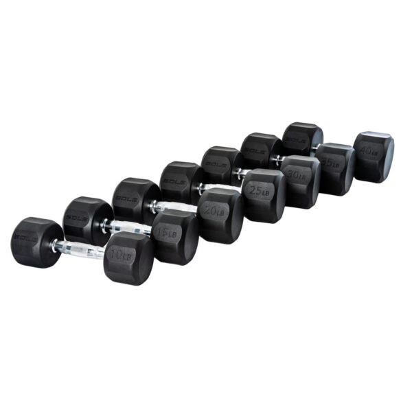 SW101 – Top Notch Quality and DurabilityThe SOLE SW101 Dumbbell set features a knurled ergonomic handle design and an anti-roll rubber-coated hexagon shape for providing essential grip and security. Full weight sets including 10, 15, 20, 25, 30, 35 and 40 lbs. This dumbbell set is great for resistance training for arms, back, chest, core, and legs.